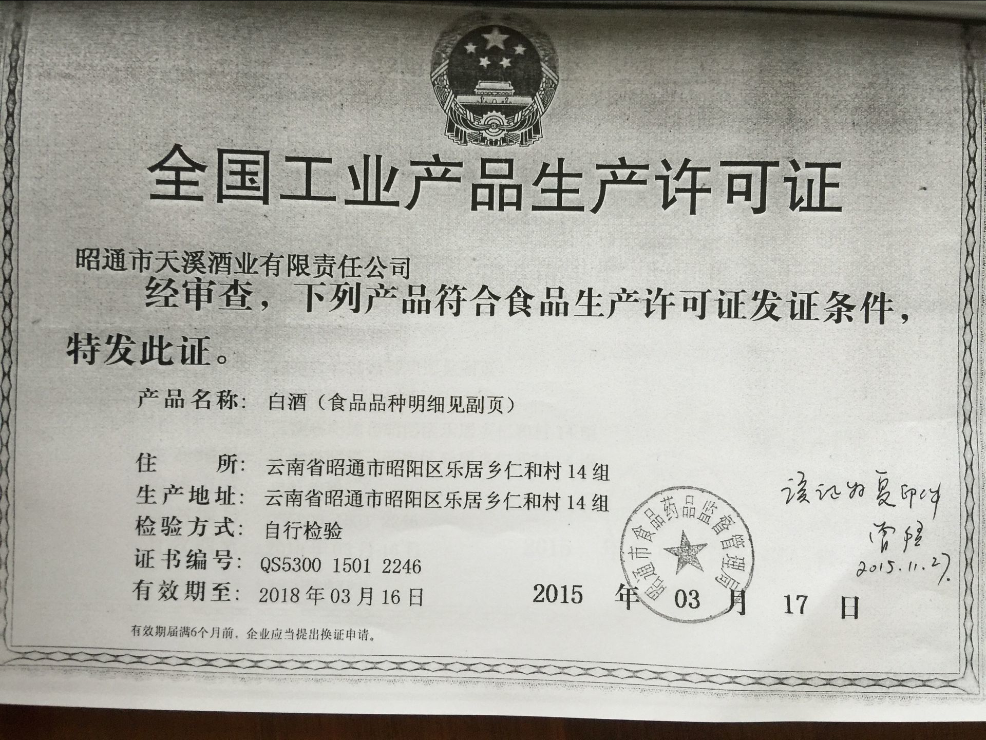 昭通市天溪酒業(yè)有限公司資質(zhì)證照復(fù)印件