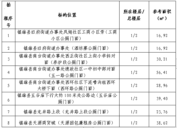 受鎮(zhèn)雄縣物業(yè)管理中心委托:公開拍租鎮(zhèn)雄縣主城區(qū)內(nèi)8個(gè)公廁門面3年期經(jīng)營權(quán)。相關(guān)事項(xiàng)如下: